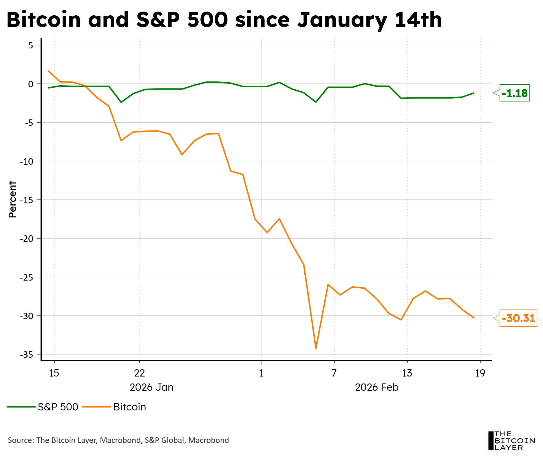 Liquidity has been trending lower since Christmas, and boy has it punished bitcoin. The stock market is undoubtedly wobbly as well but holding it much better on an absolute return basis since our red dot was confirmed on January 14th: