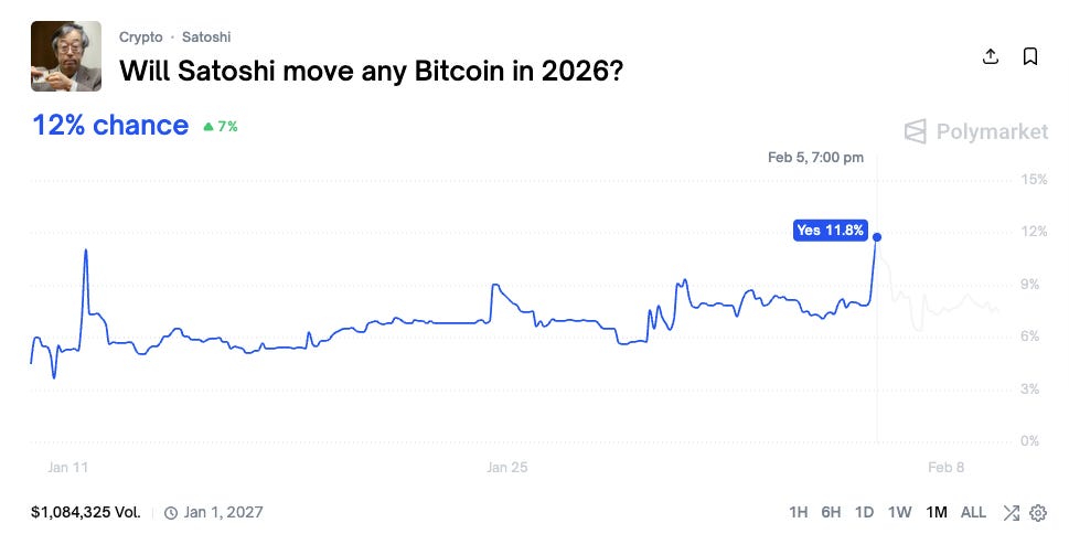 Such low probability moves even prompted some spectators out there to raise the odds on Satoshi himself moving some coins this year, reaching nearly 12% before resetting back to their sub-10% usual (chart below):