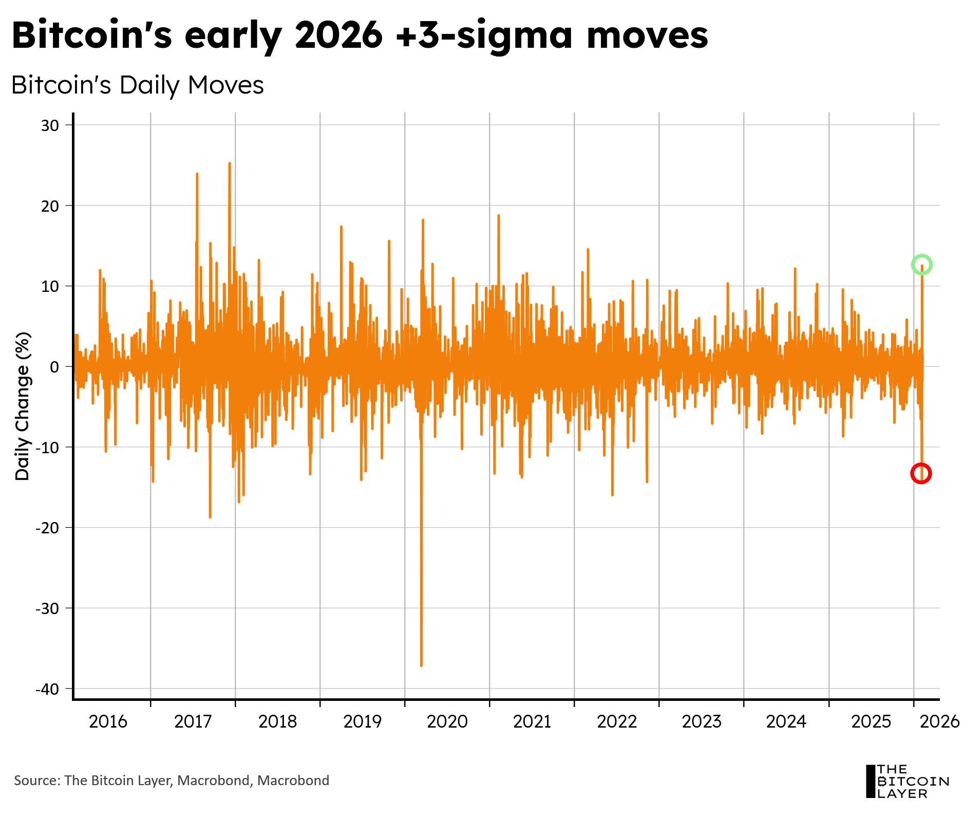Last week, all hell broke loose. Bitcoin had a +three-sigma move to the downside and a +three-sigma move to the upside from one day to the next (chart below):