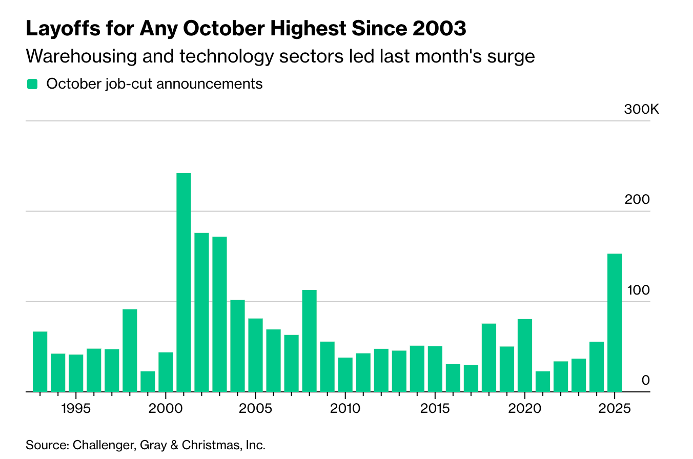 Last week amid the government shutdown, Challenger, Gray and Christmas, a Chicago-based outplacement firm that has tracked corporate layoff announcements across the United States for sixty years, reported more than 153,000 job cuts in October, the most for any October since 2003.