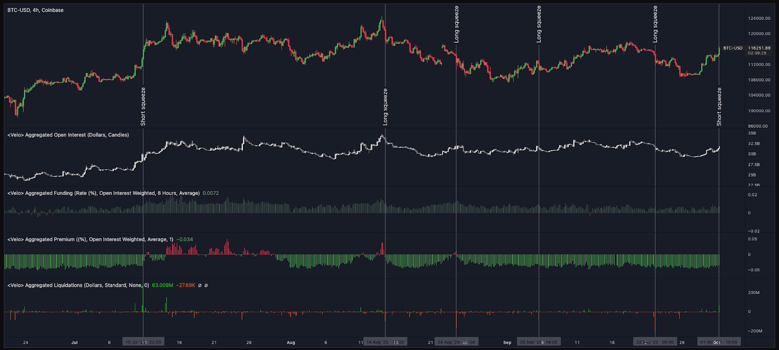 In July, this dynamic fueled a short squeeze, where forced buyers (short sellers covering positions) drove the price to new highs. In August and September, however, we saw long squeezes, as leveraged longs were forced to sell to exit their positions.