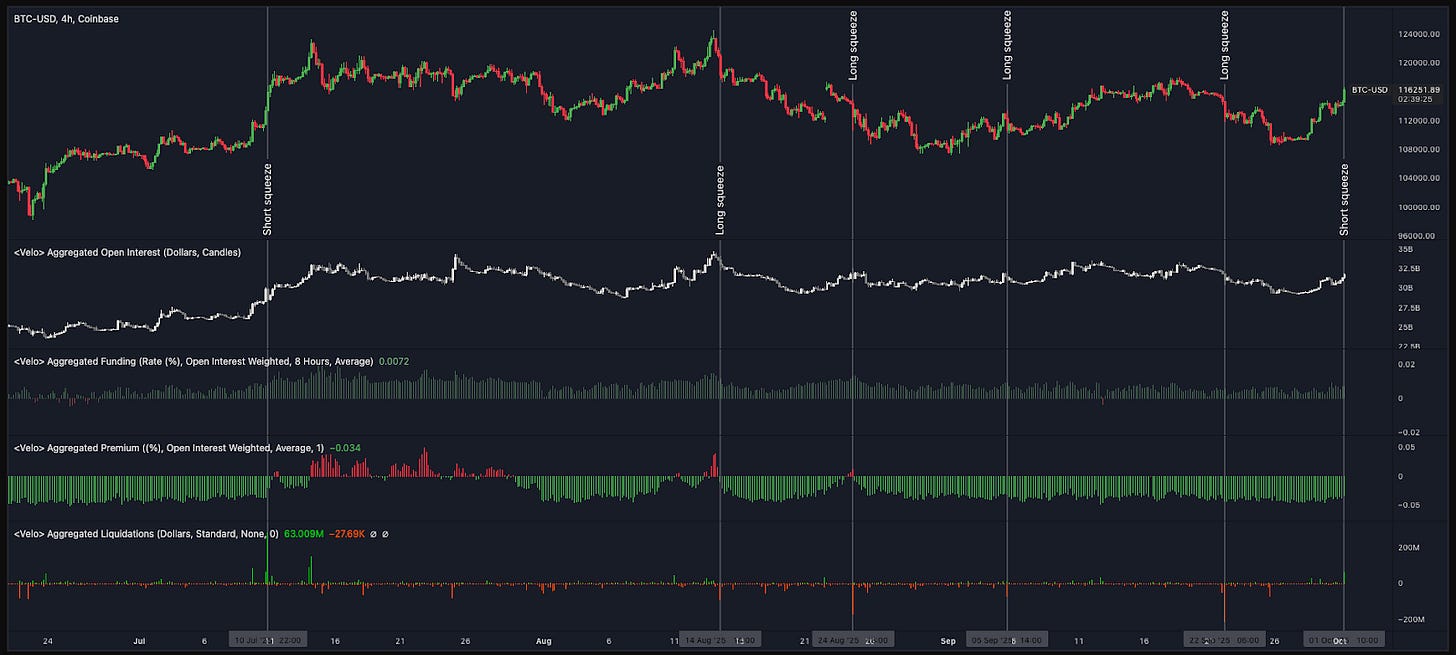 Currently, we’re seeing the beginnings of a minor short squeeze, helping push price higher. On an aggregated basis, the swap market (perpetual futures across exchanges like Binance, Bybit, Deribit, and Hyperliquid) looks fairly balanced. The aggregated funding rate sits at 0.0072%, or 7.9% annualized, which is not unusual. The aggregated premium is negative, meaning bitcoin spot prices are higher than swap prices. This run-up looks healthy: it’s less about excessive long exposure and more about shorts being washed out.