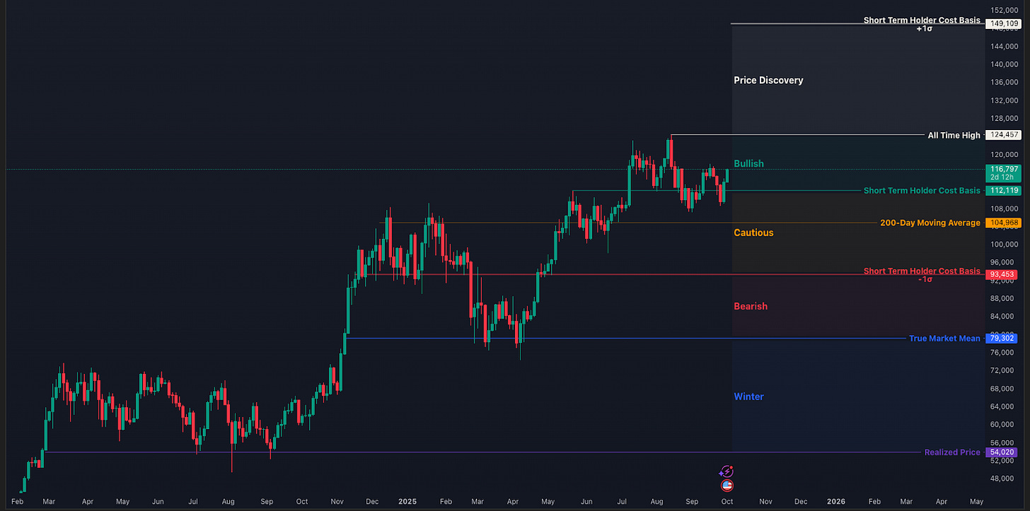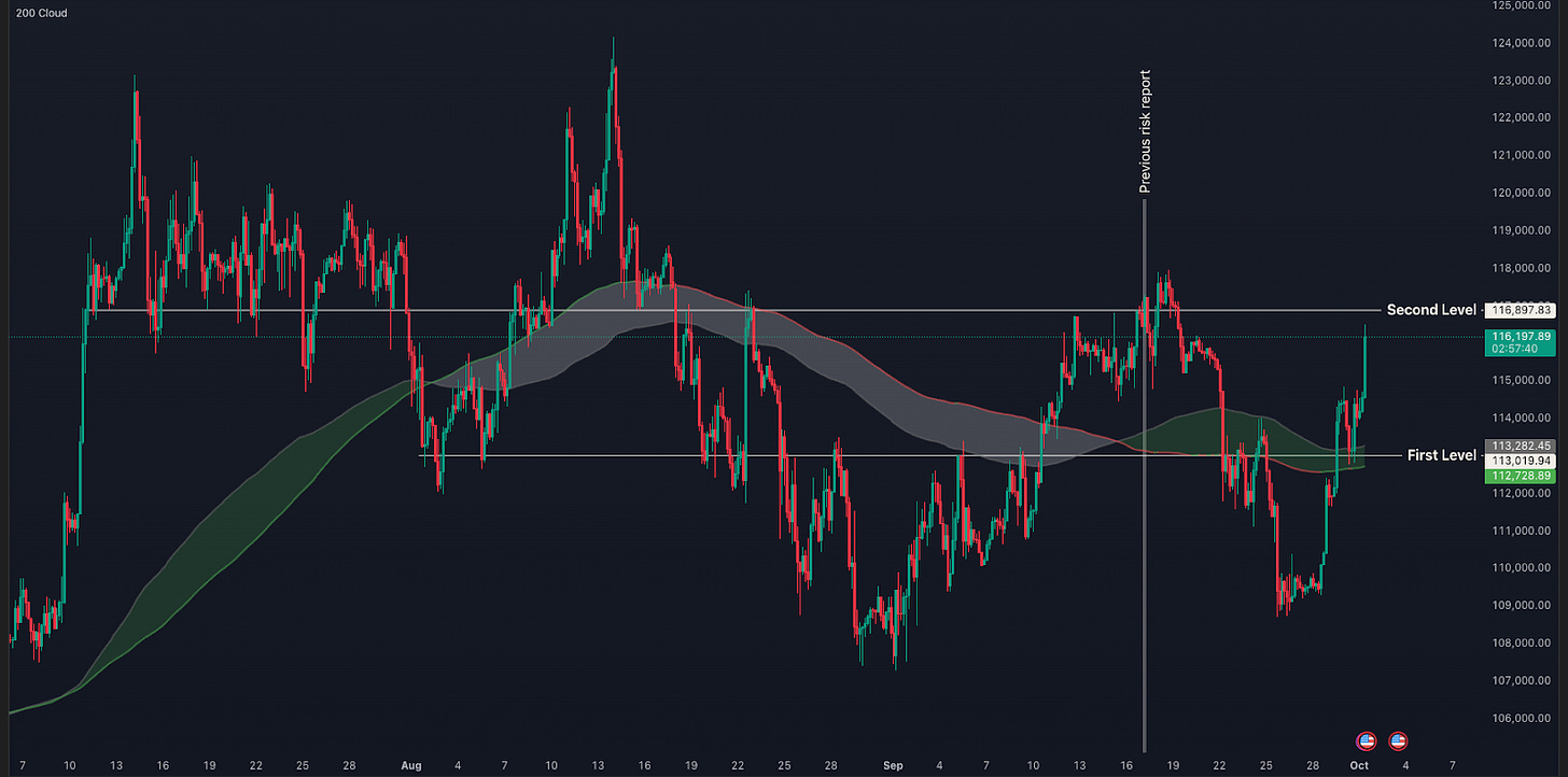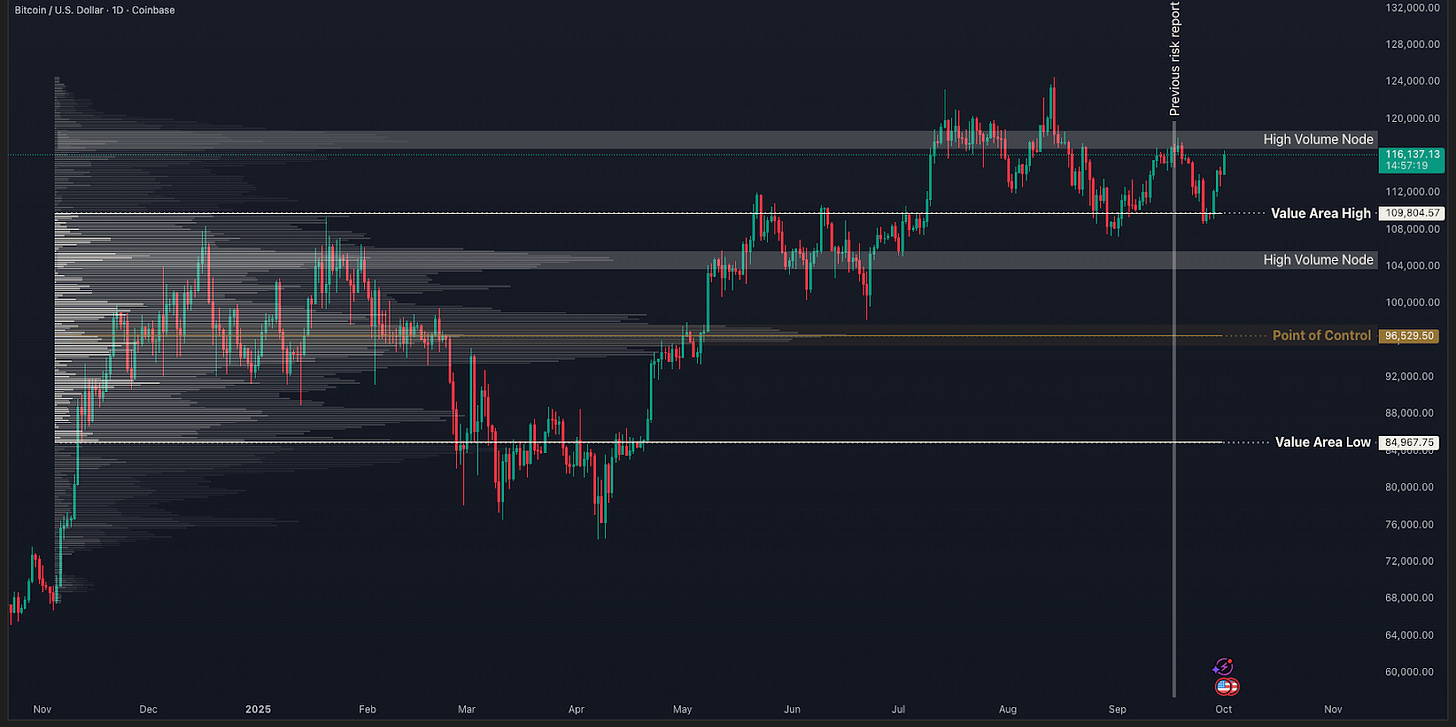 Let’s look more closely at what happened over the last two weeks. We identified two important low timeframe levels that bitcoin needed to reclaim in order to invalidate further downside. After hitting $108,000 at the end of August, price recovered to $117,000, where it was rejected. We’ll see in the next chart why that likely happened.