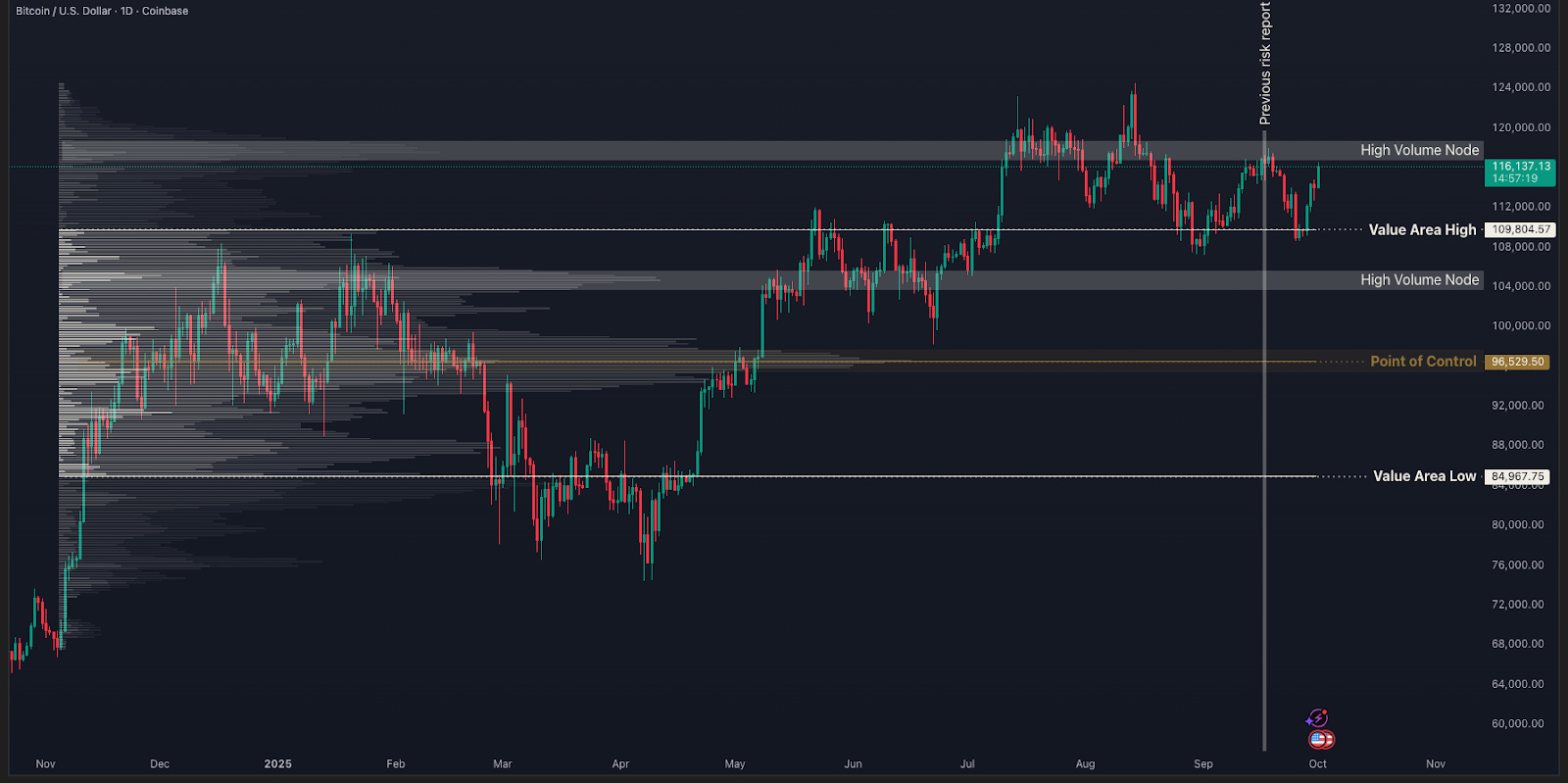 As discussed in earlier reports, the volume profile showed a High Volume Node around $117,000, which we flagged as potential resistance. Price is now gearing up for another attempt to break through this level. If it succeeds—whether on this try or the next—it would signal that the bulls aren’t ready to pack their bags just yet, but instead want another shot at the ‘price discovery’ zone.