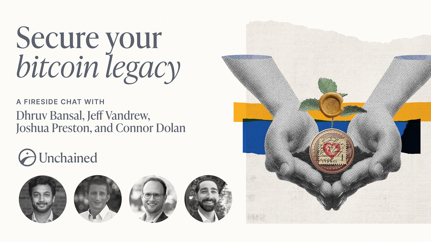 On Wednesday, Nov 19 at 11:00 AM CT, join Dhruv Bansal (CSO, Unchained), Jeff Vandrew (CFO & CLO, Unchained), and Joshua Preston (CEO, Gannett Trust) for a live fireside chat on how to make your bitcoin legacy secure, simple, and built to last. We’ll cover: