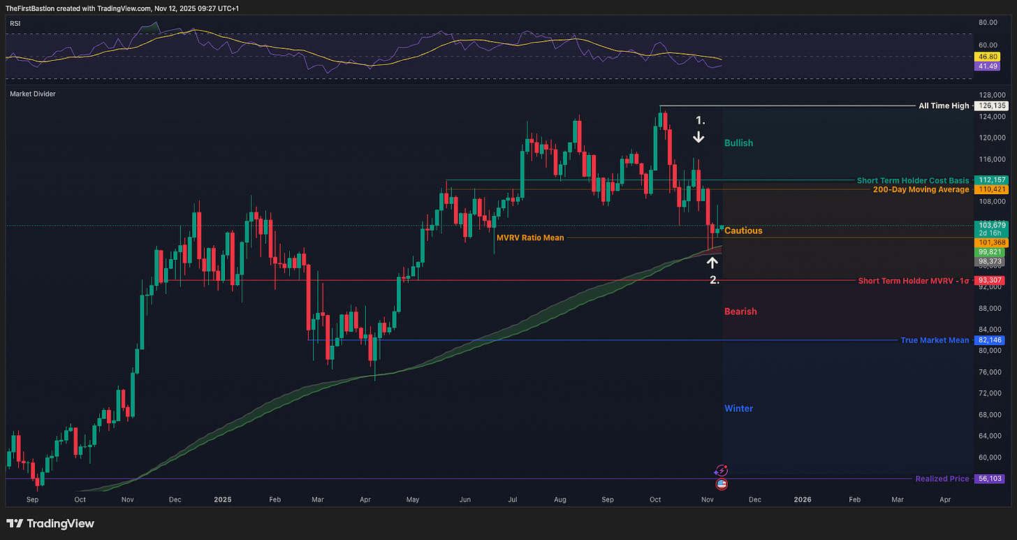 During our last risk report two weeks ago, bitcoin was trading around $113,000, which at that time was equal to the Short-Term Holder Cost Basis (arrow number 1 on chart below).