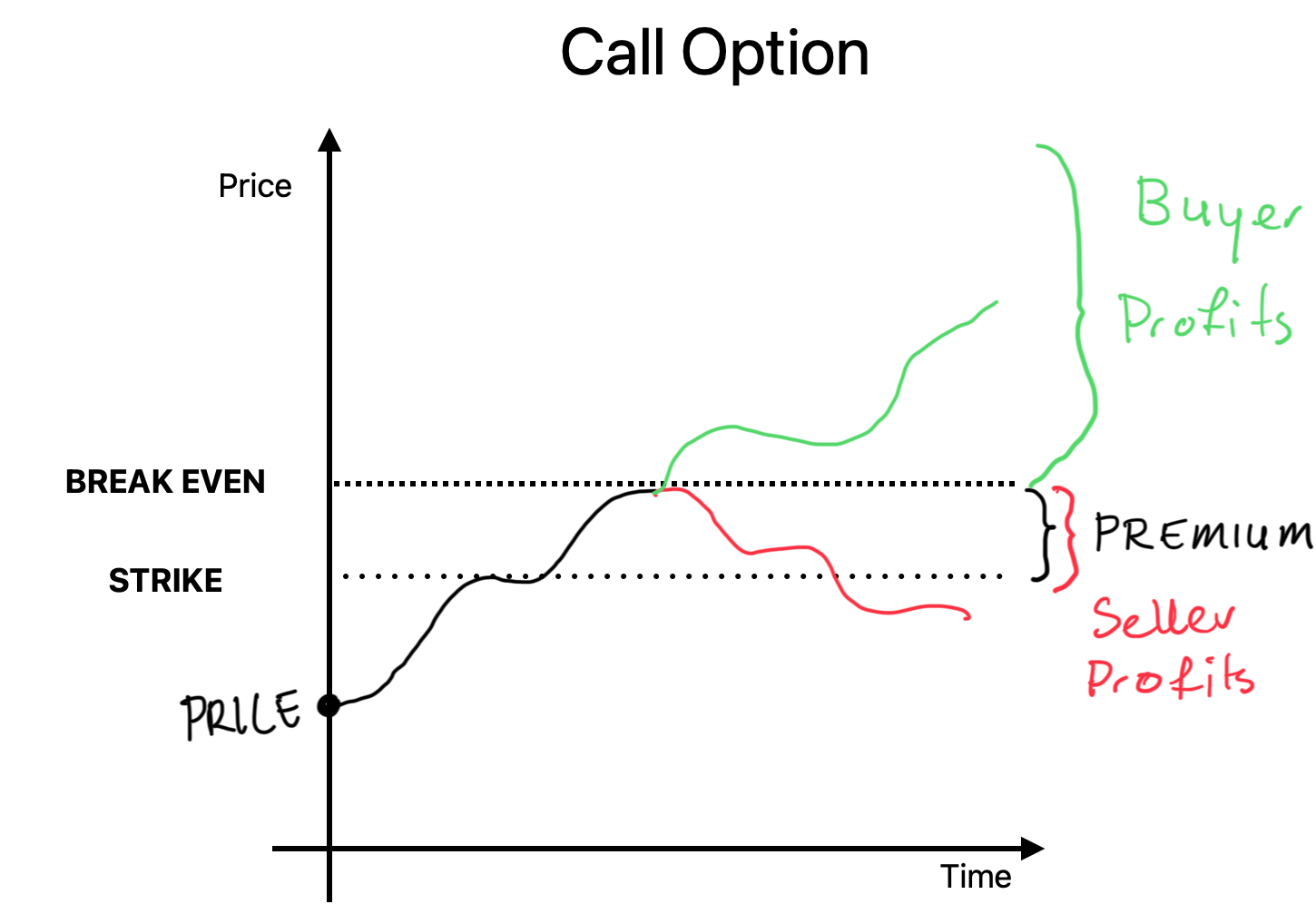 And this is also where strategies come into play. The seller of the call option could have covered that risk with buying the underlying asset. Because what happens if this scenario with very low probability actually does happen, the appreciation of the asset covers the dollar amount of his obligation. He has to sell 1 bitcoin at $100,000. If you don’t have that bitcoin, you better have enough cash laying around. But if you do have 1 bitcoin, it won’t be the best trade he ever did, but he does have the money to meet his obligations. This strategy covers the risk of the seller, hence the name “Covered Call”.